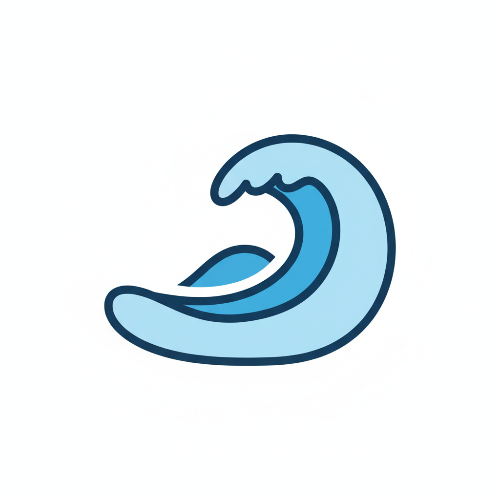 Stilisierte blaue Welle mit dunkler Kontur auf weißem Hintergrund, minimalistisches Design.