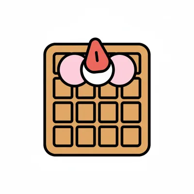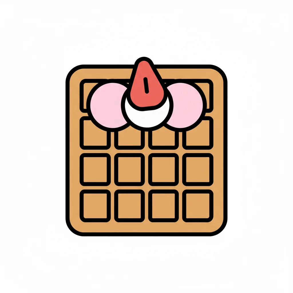Cartoon-Waffel mit rosa Eis, Sahne und Erdbeere auf weißem Hintergrund, minimalistischer Stil.