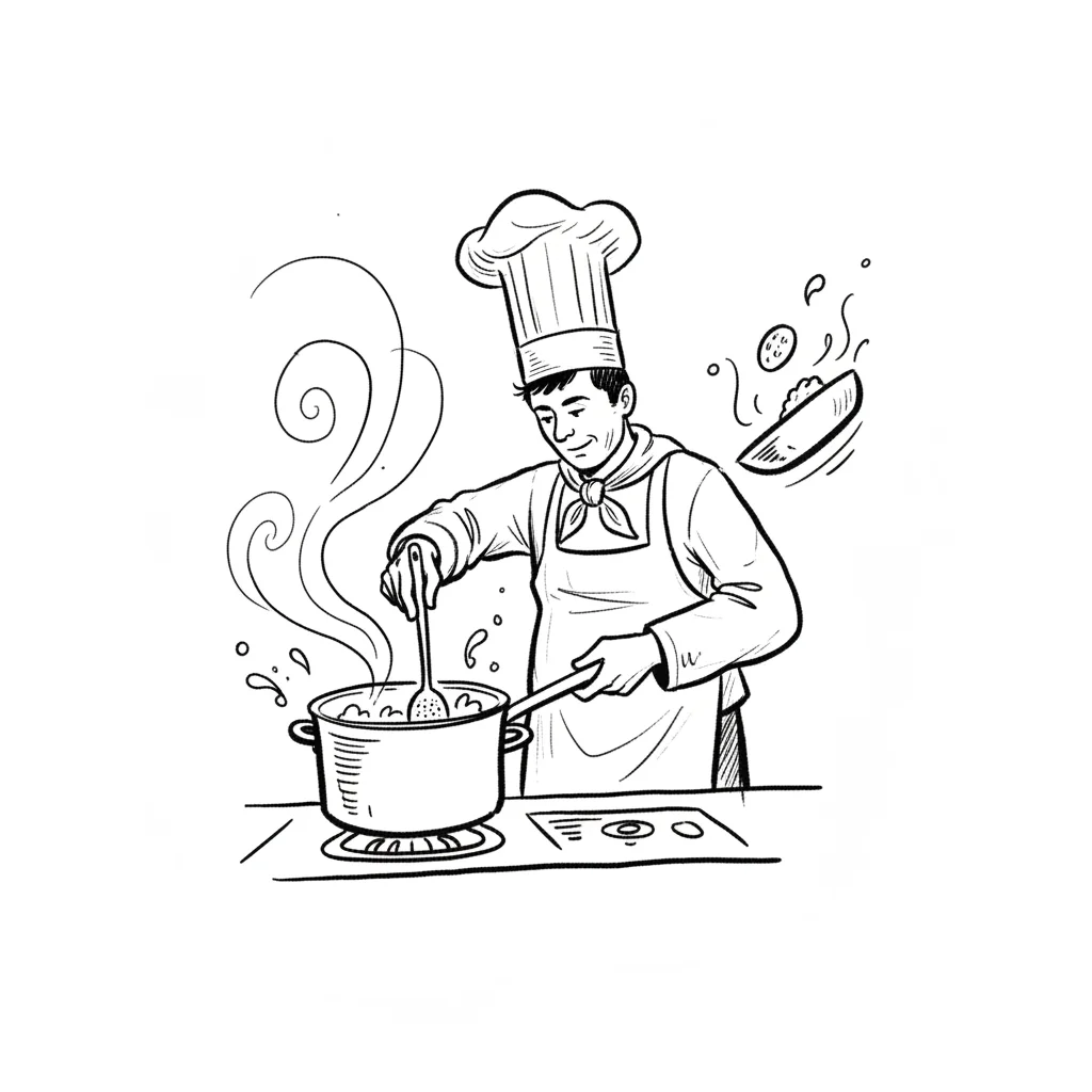 Ein lächelnder Koch rührt in einem Topf auf dem Herd, während er Essen in einer Pfanne schwenkt.
