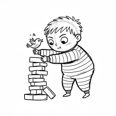 Ein Junge baut einen Turm aus Bauklötzen, während ein kleiner Vogel auf seiner Hand sitzt.