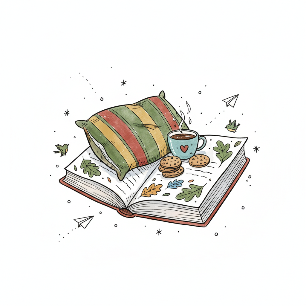 Gemütliche Illustration: Offenes Buch mit Kissen, dampfendem Kaffee, Keksen und Herbstblättern.