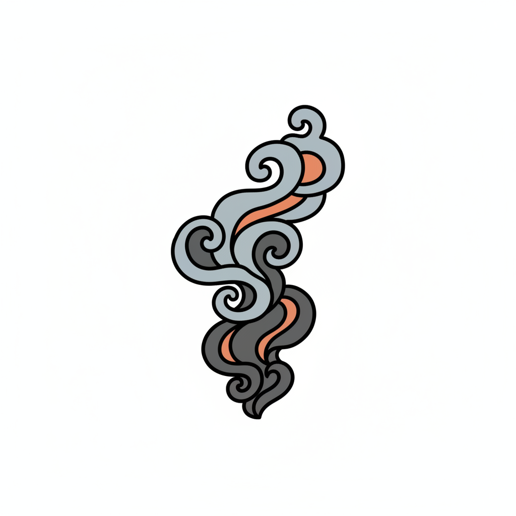 Stilisierte Rauch- oder Dampfschwaden in Grau- und Orangetönen mit schwarzen Konturen.