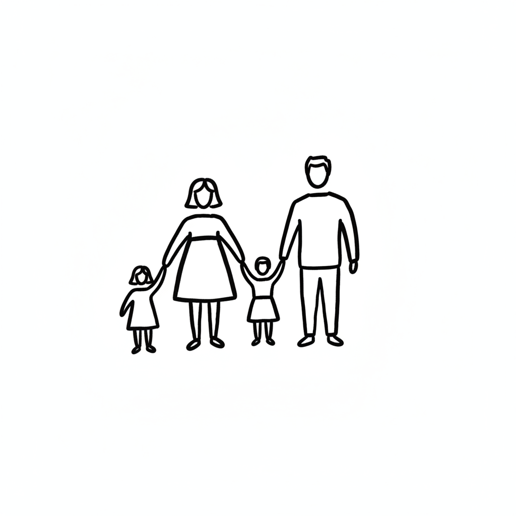 Minimalistische Strichzeichnung einer Familie: Eltern mit zwei Kindern, die Händchen halten.