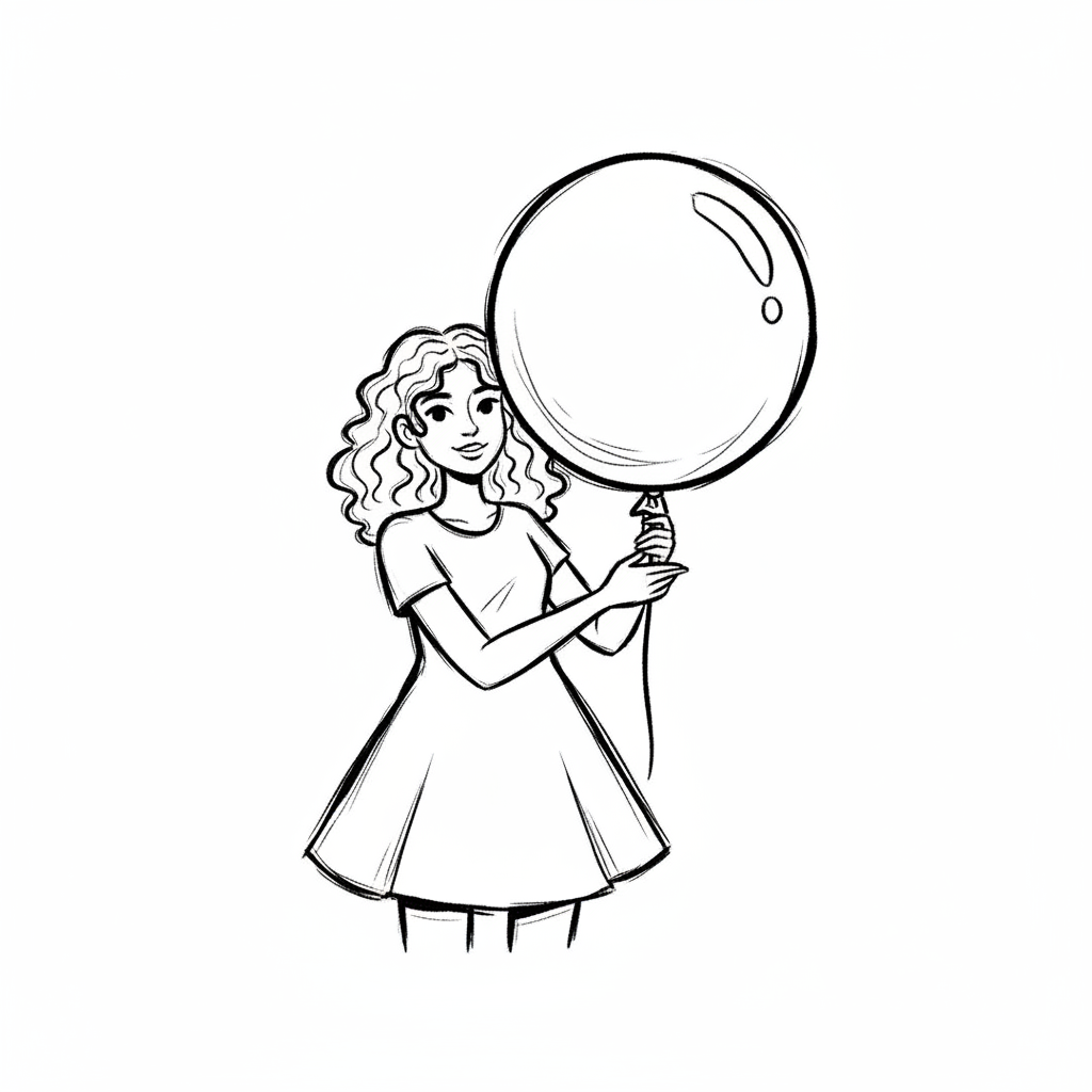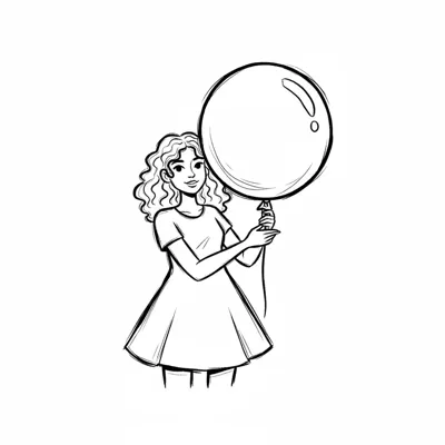 Schwarz-weiß-Zeichnung einer lächelnden Frau mit lockigem Haar, die einen großen Ballon hält.