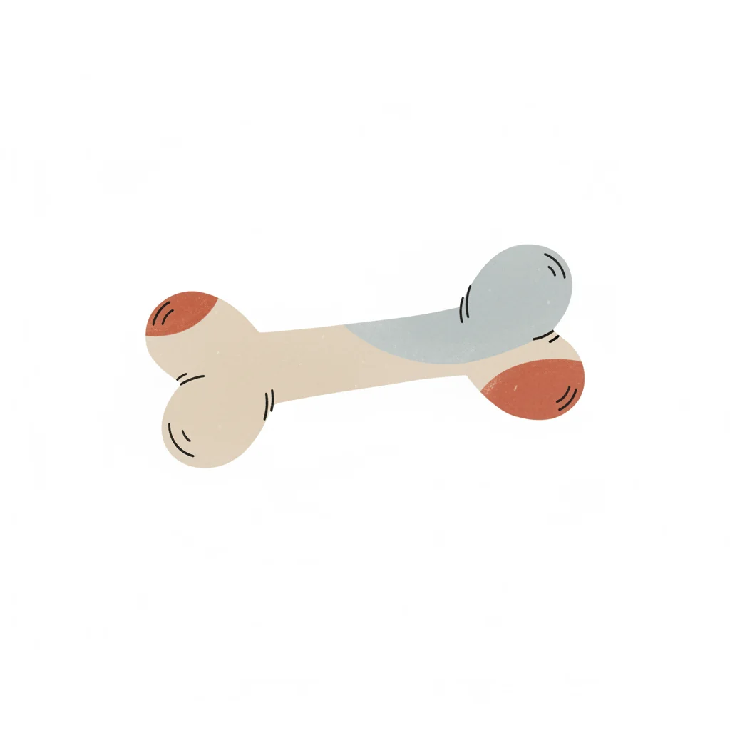 Stilisierte Illustration eines Knochens in Beige, Hellblau und Rotbraun auf weißem Hintergrund.