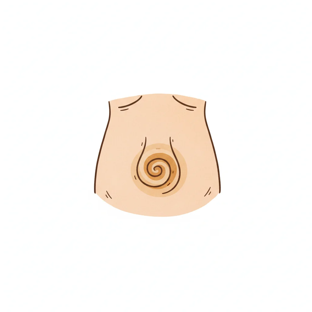Illustrierter Bauch mit spiralförmigem Bauchnabel auf hellem Hintergrund.