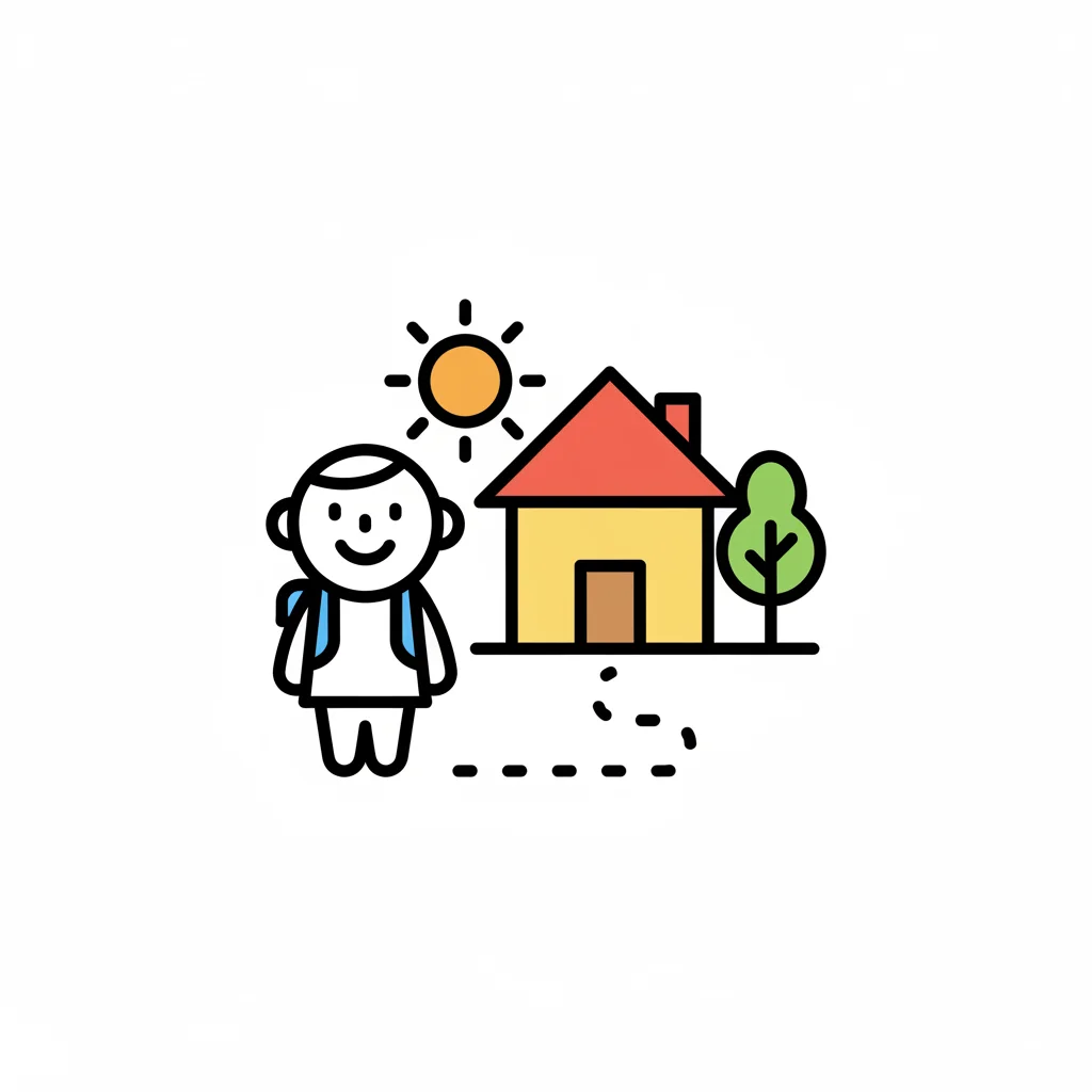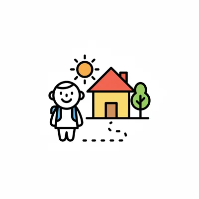 Ein lächelndes Kind mit Rucksack geht auf einem gepunkteten Weg zu einem Haus mit Baum und Sonne.