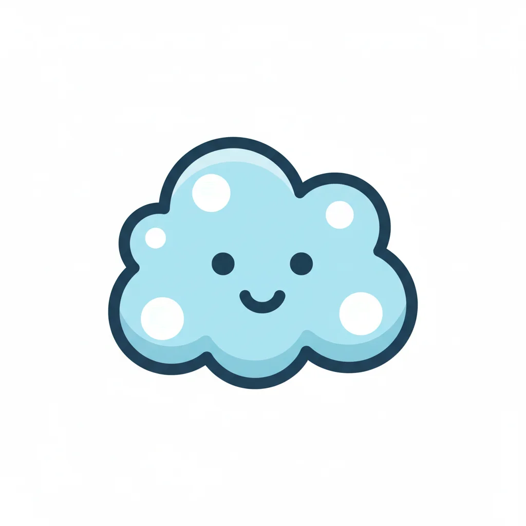 Niedliche, hellblaue Cartoon-Wolke mit lächelndem Gesicht und weißen Punkten auf weißem Hintergrund.