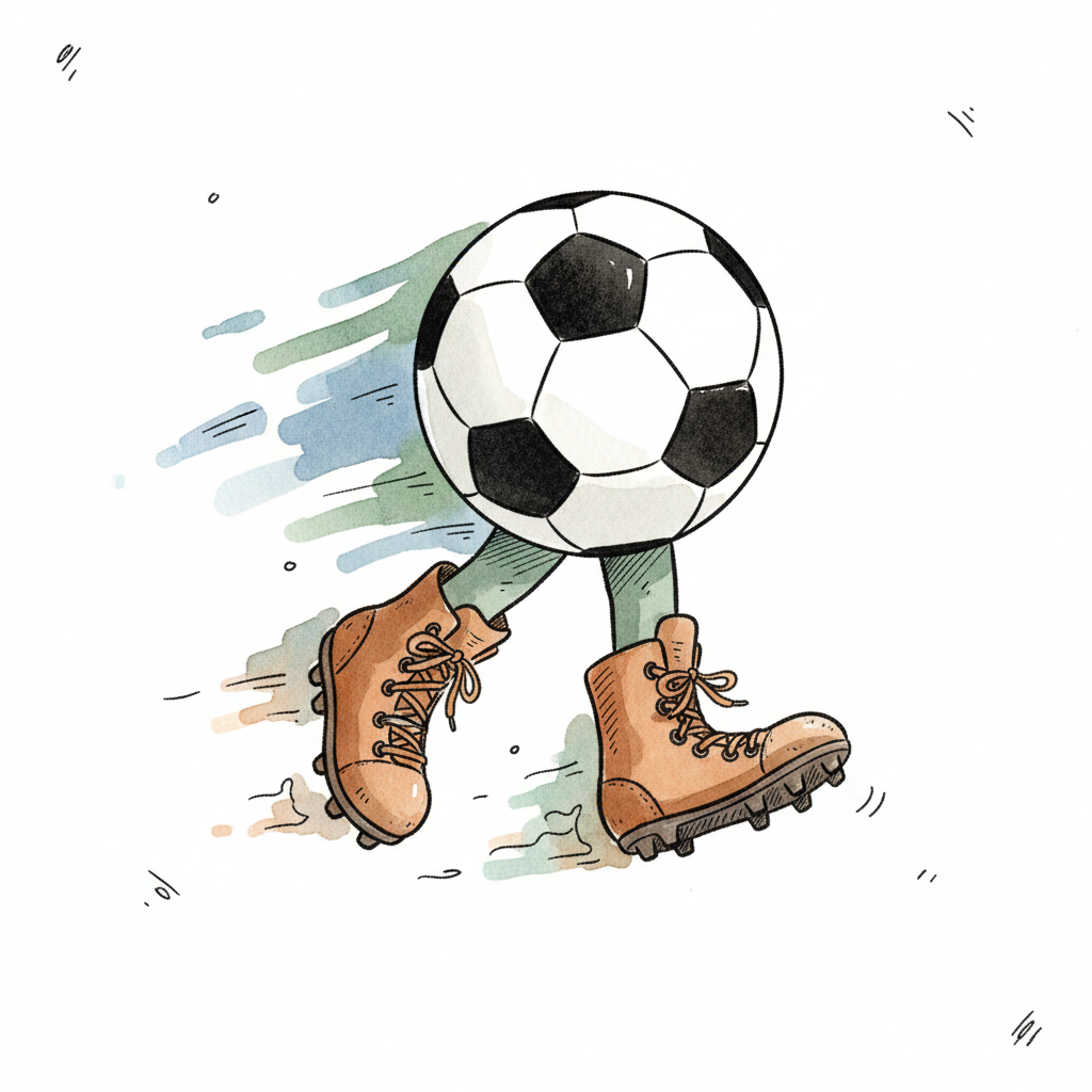 Ein Fußball bewegt sich auf gemalten Füßen mit Stollen-Schuhen.
