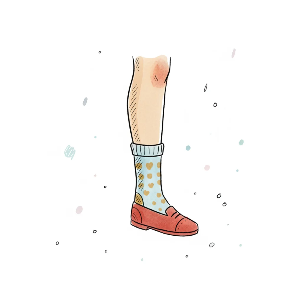 Ein lässiger Fuß mit bunten Socken und Schuhen, umgeben von kleinen Punkten.