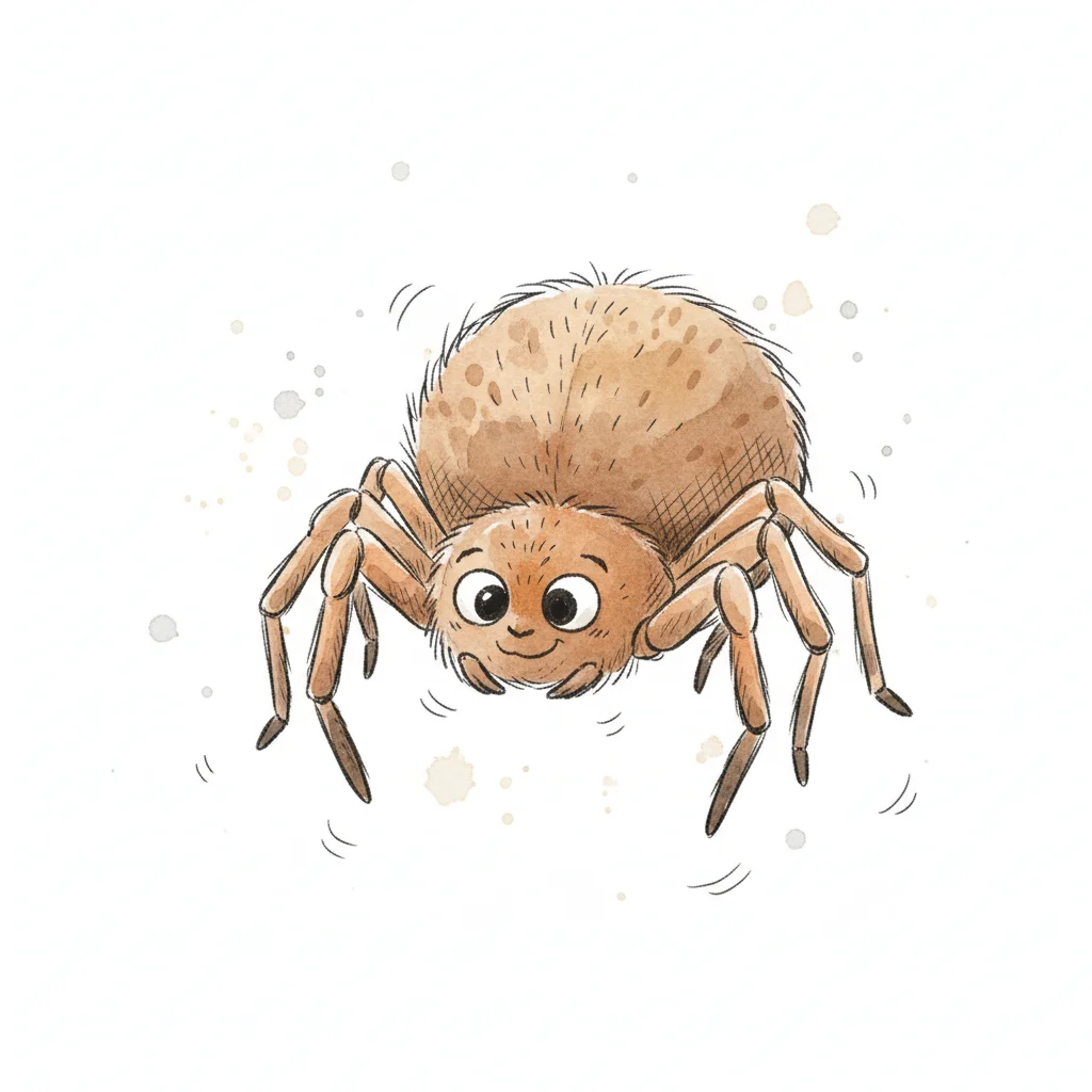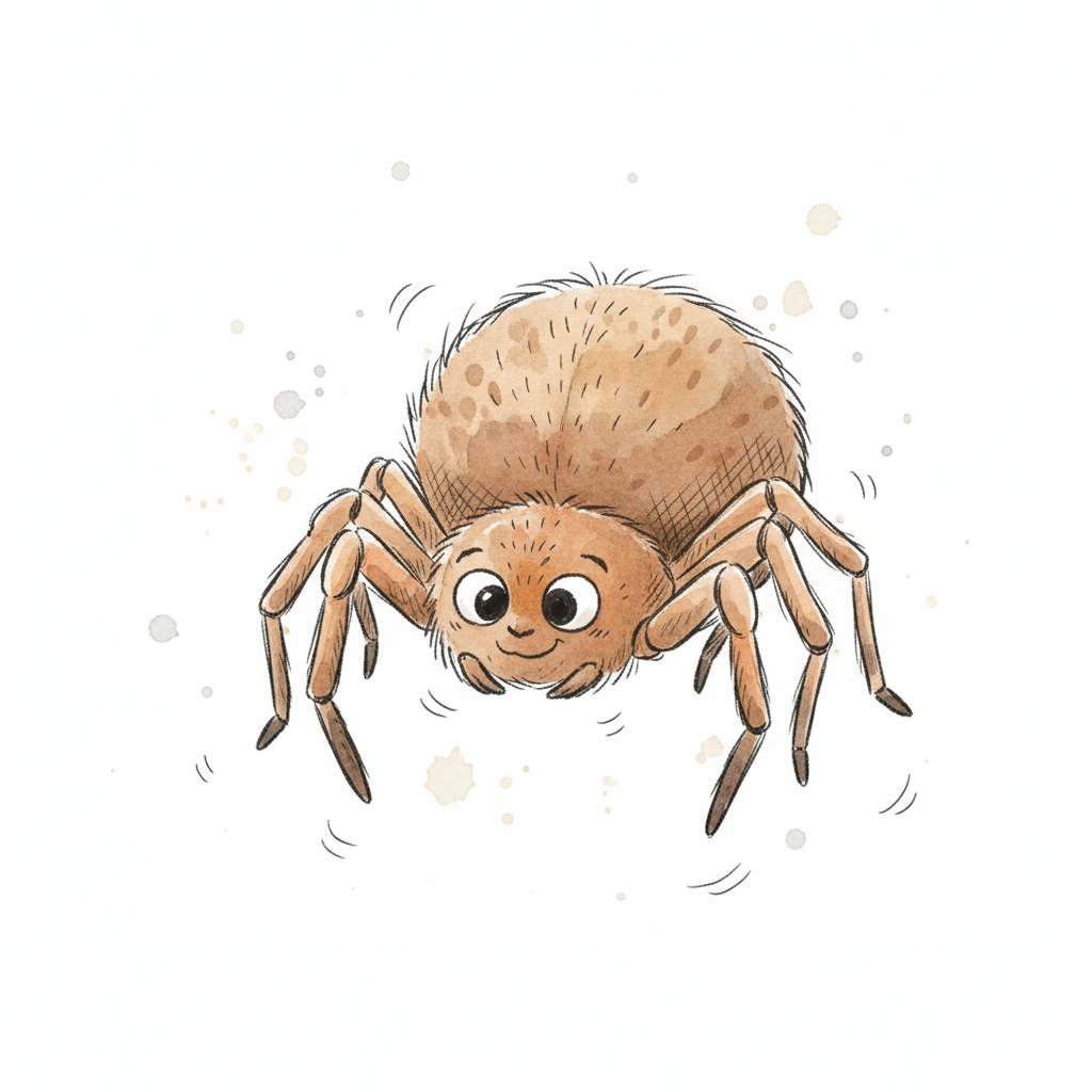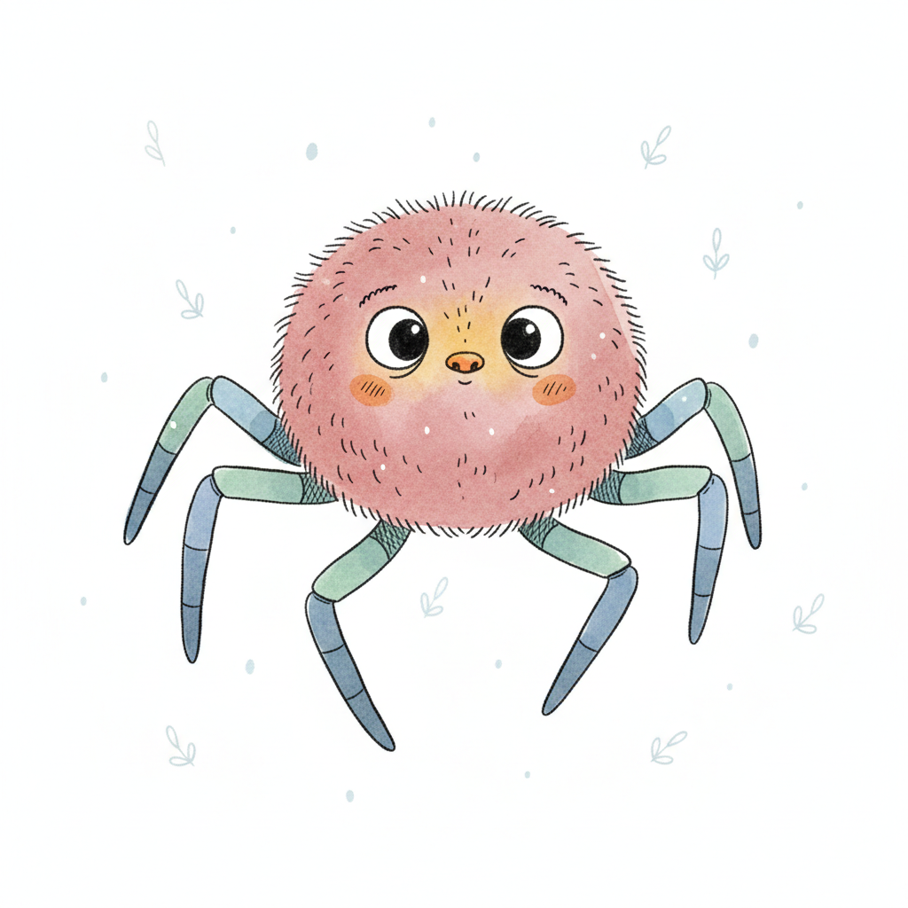 Eine niedliche, cartoonhafte Spinne mit großen Augen und einem freundlichen Ausdruck.