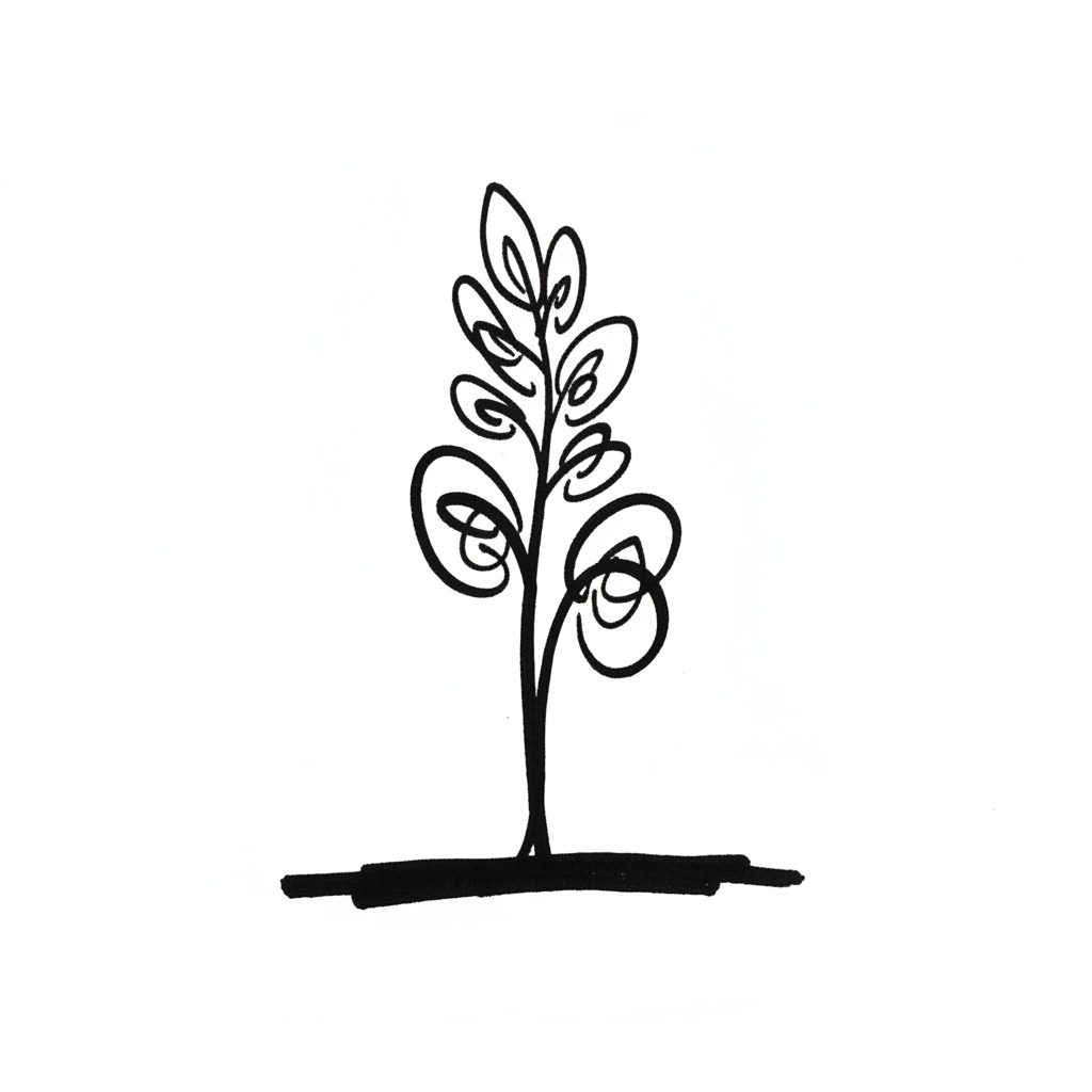 Minimalistische Schwarz-Weiß-Zeichnung eines Baumes mit lockigen Blättern auf weißem Grund.