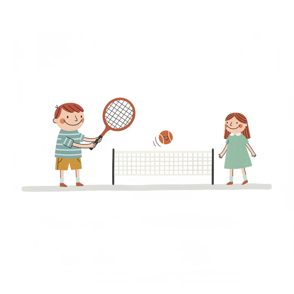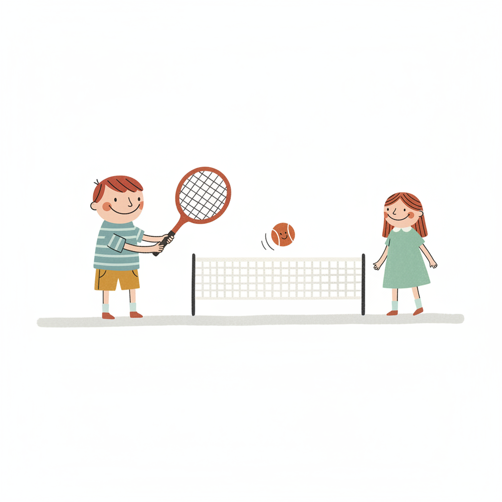 Fröhliche Kinder spielen Tennis. Ein Junge schlägt den Ball über das Netz zu einem Mädchen.