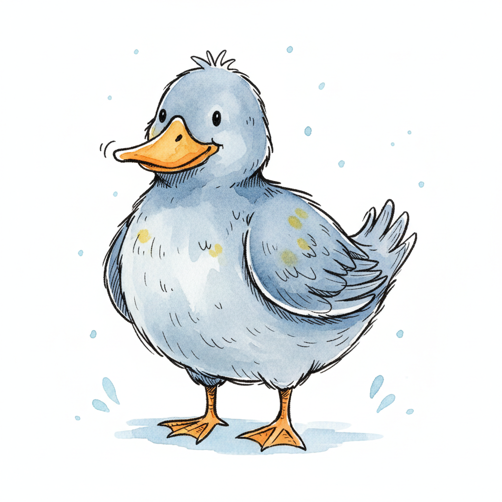 Eine süße, cartoonhafte Ente mit blauen Federn steht fröhlich da.