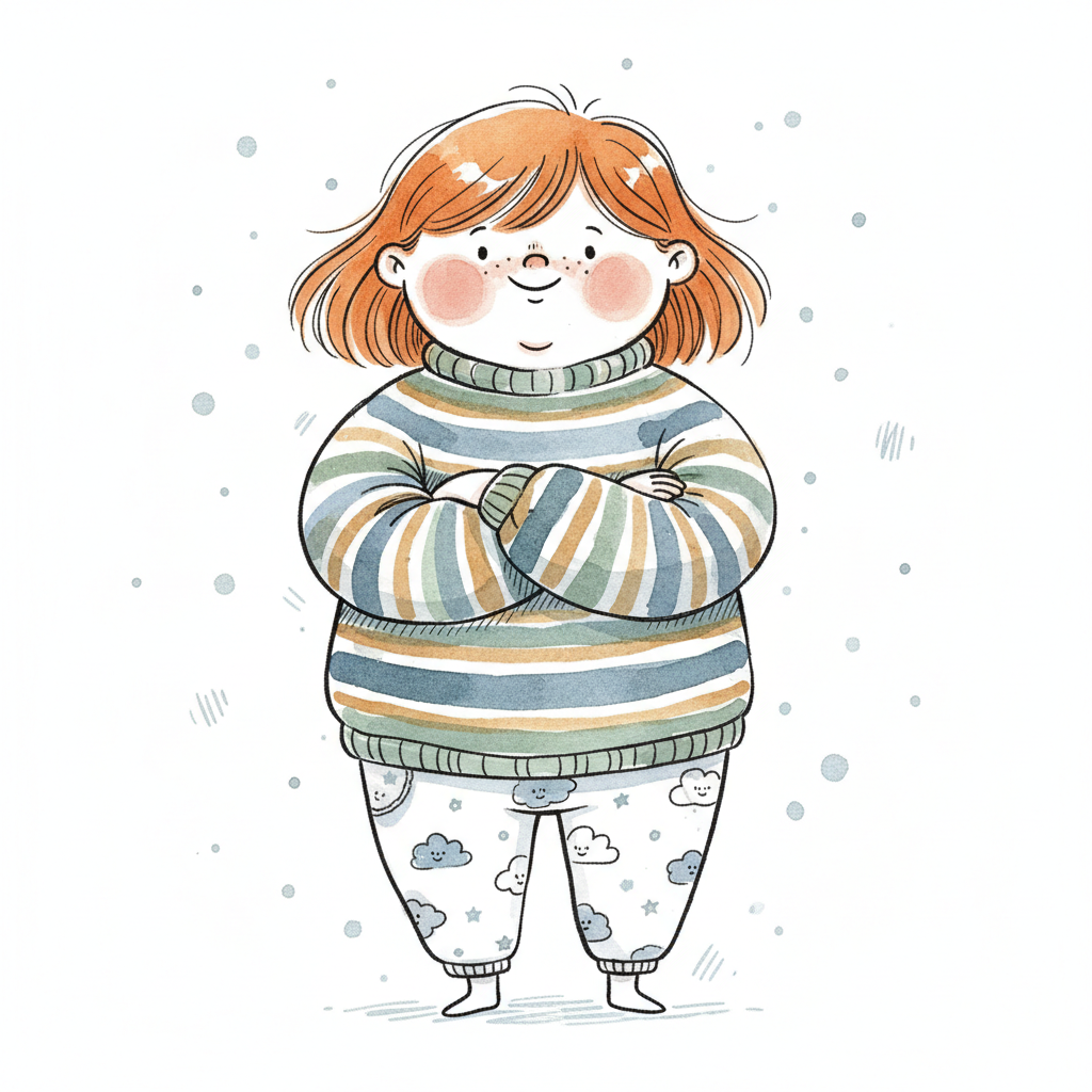 Niedliche, kindgerecht illustrierte Szene mit einem Kind oder einer Person als Hauptfigur, vor rein weißem Hintergrund, im frech-nordischen Aquarell-Skizzenstil. Klare, leicht wackelige Tuschekonturen, sichtbare Pinsel- und Strichtextur, dezente Schraffuren, weiche handgemalte Farbflächen in gedeckten Farben. Einfache, runde Formen. Keine harten Schatten, sondern sanfte, transparente Aquarellschichten. Leicht raue, handgezeichnete Linien statt glatter Vektorkanten. Subtile, vereinzelte Kritzelpunkte oder kleine Details im Hintergrund (wie Pünktchen oder feine Striche), aber keine echte Umgebung oder Landschaft. Die Figur ist mittig zentriert. Insgesamt charmant, humorvoll, warm und handgemacht wirkend. WICHTIG: Das Bild darf ABSOLUT KEINEN TEXT, KEINE BUCHSTABEN und KEINE ZAHLEN enthalten.