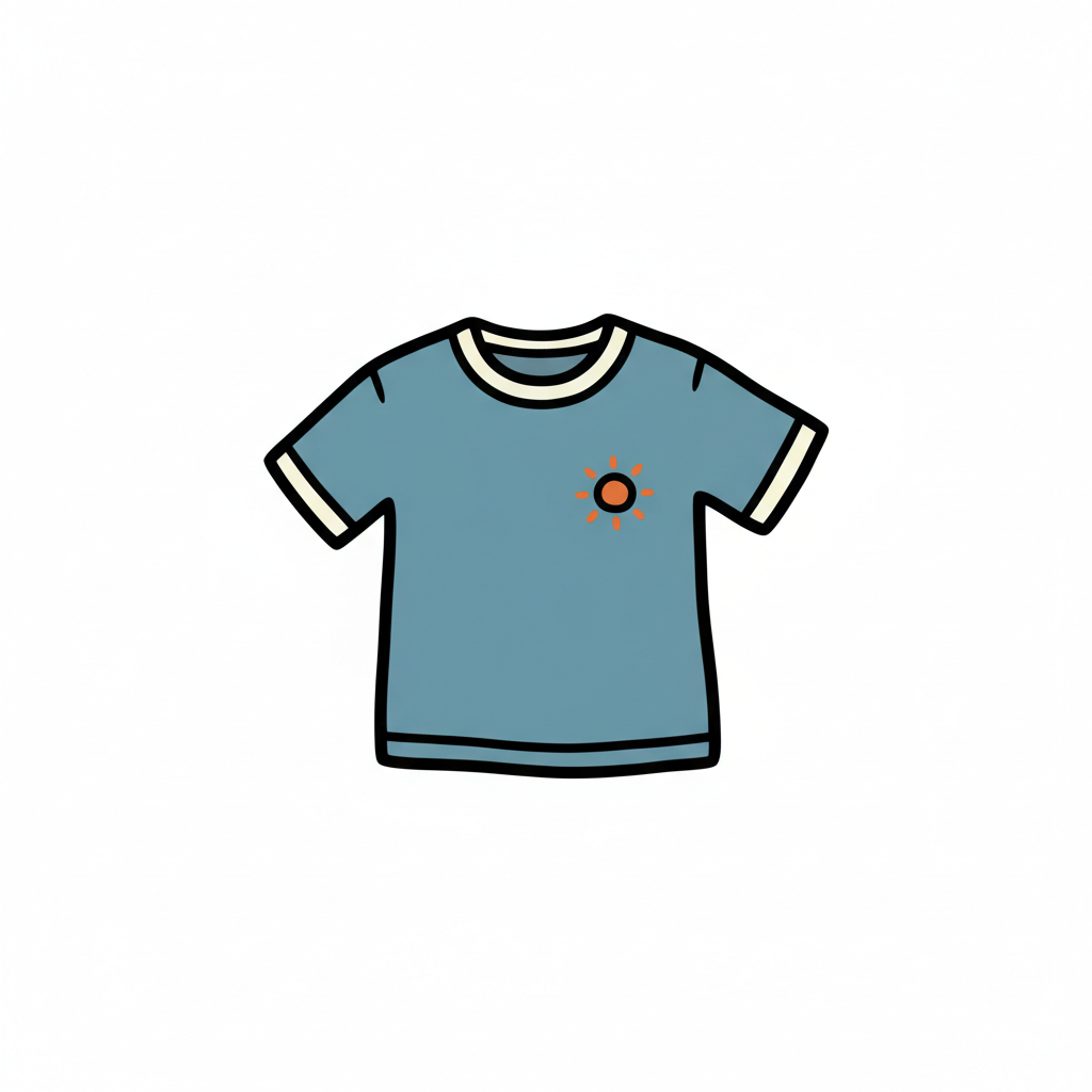 Hellblaues Cartoon-T-Shirt mit weißem Saum und kleiner orangefarbener Sonne auf der Brust.