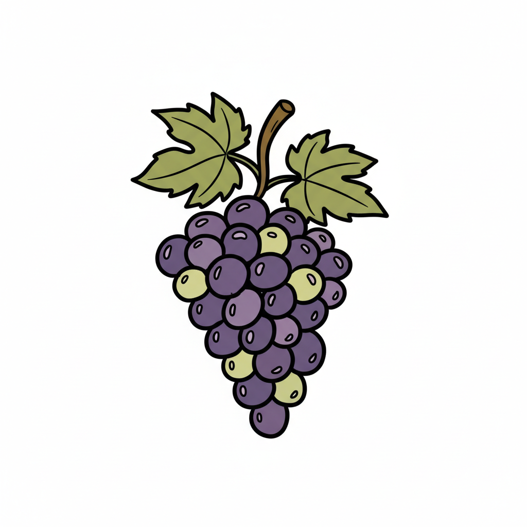 Bunte Illustration einer Traube mit lila und hellgrünen Beeren und grünen Blättern.