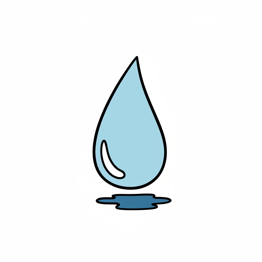 Eine hellblaue Wassertropfen-Illustration mit einer kleinen Pfütze darunter auf weißem Grund.