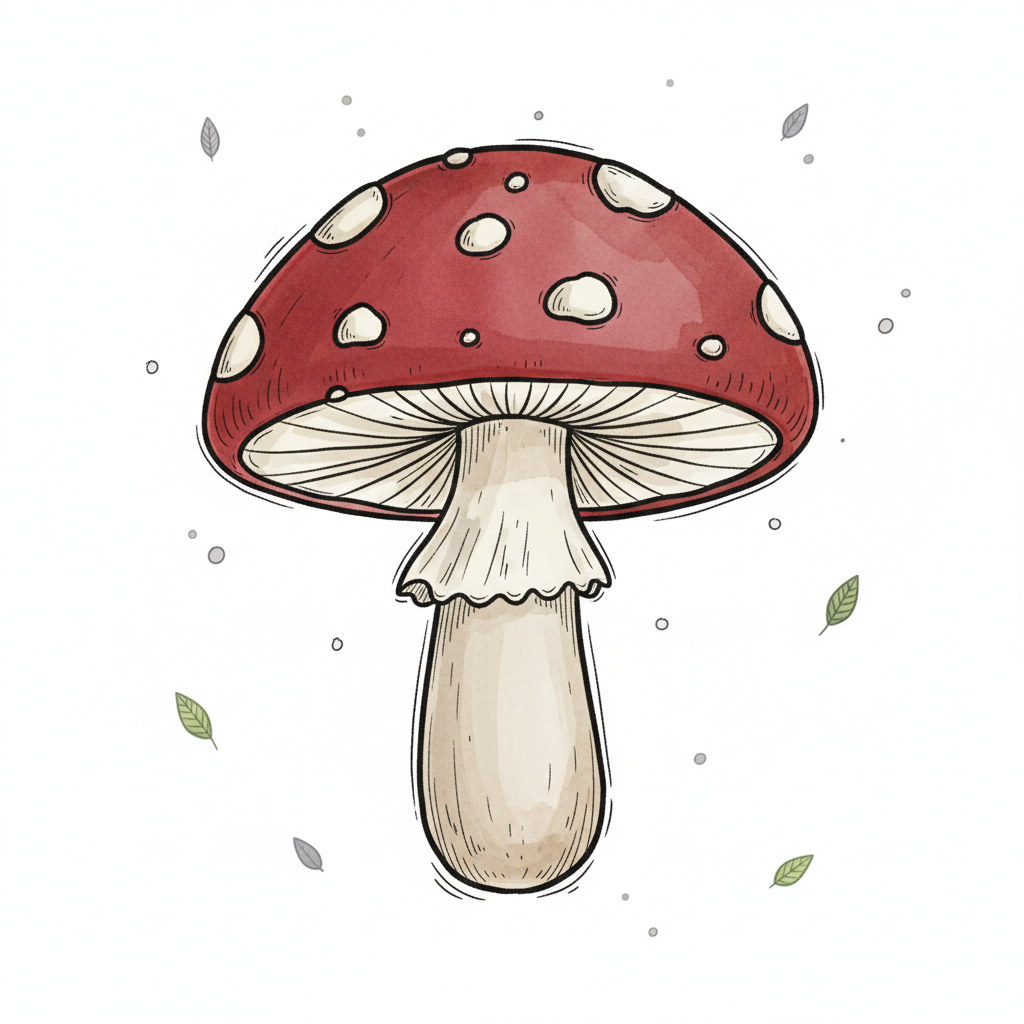 Ein handgezeichneter Fliegenpilz mit rotem Hut und weißen Punkten, umgeben von kleinen Blättern.