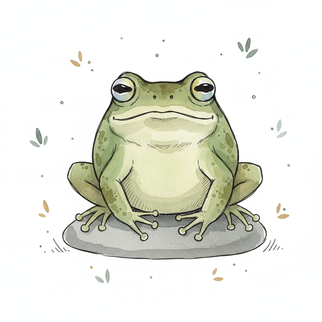 Niedliche grüne Frosch-Illustration im Aquarellstil, sitzt auf einem Stein mit kleinen Blättern.