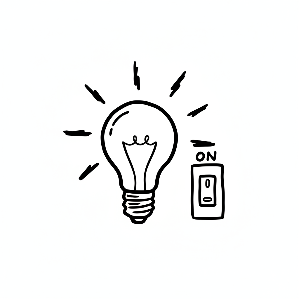 Handgezeichnete, leuchtende Glühbirne mit eingeschaltetem Schalter, symbolisiert eine Idee.