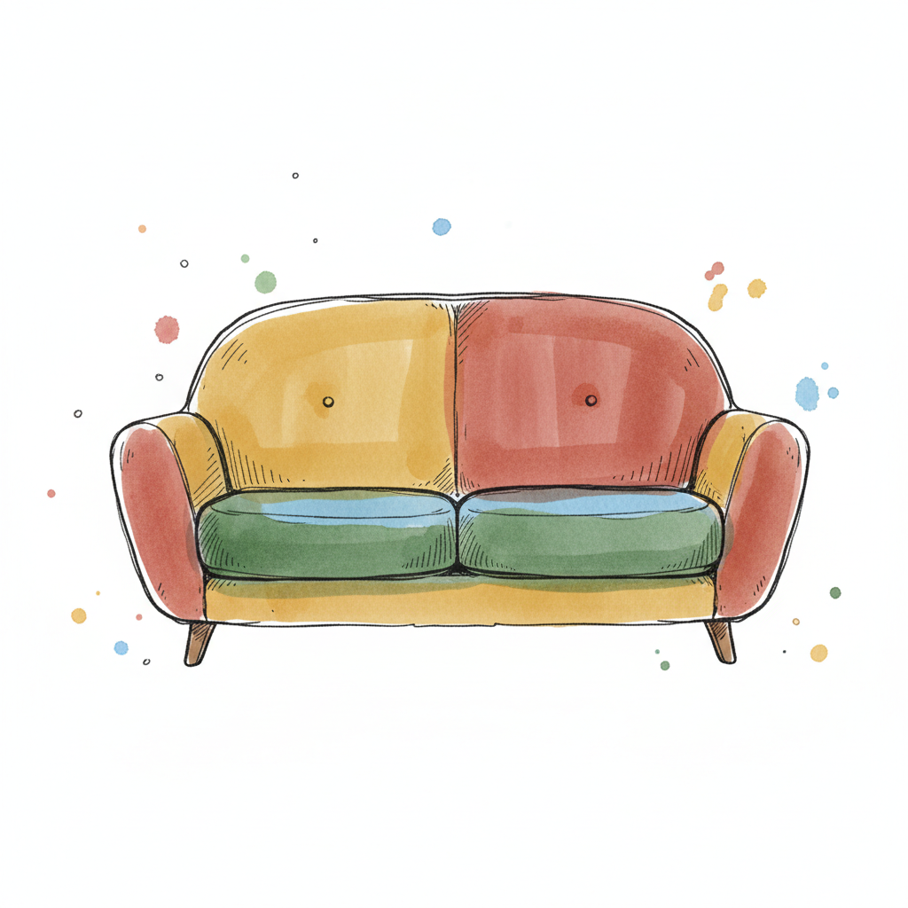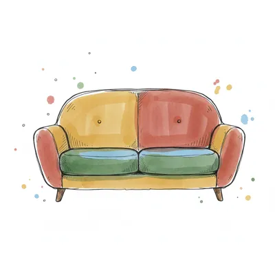 Buntes Aquarell-Sofa in Gelb, Rot, Grün und Blau mit Farbspritzern im Hintergrund.