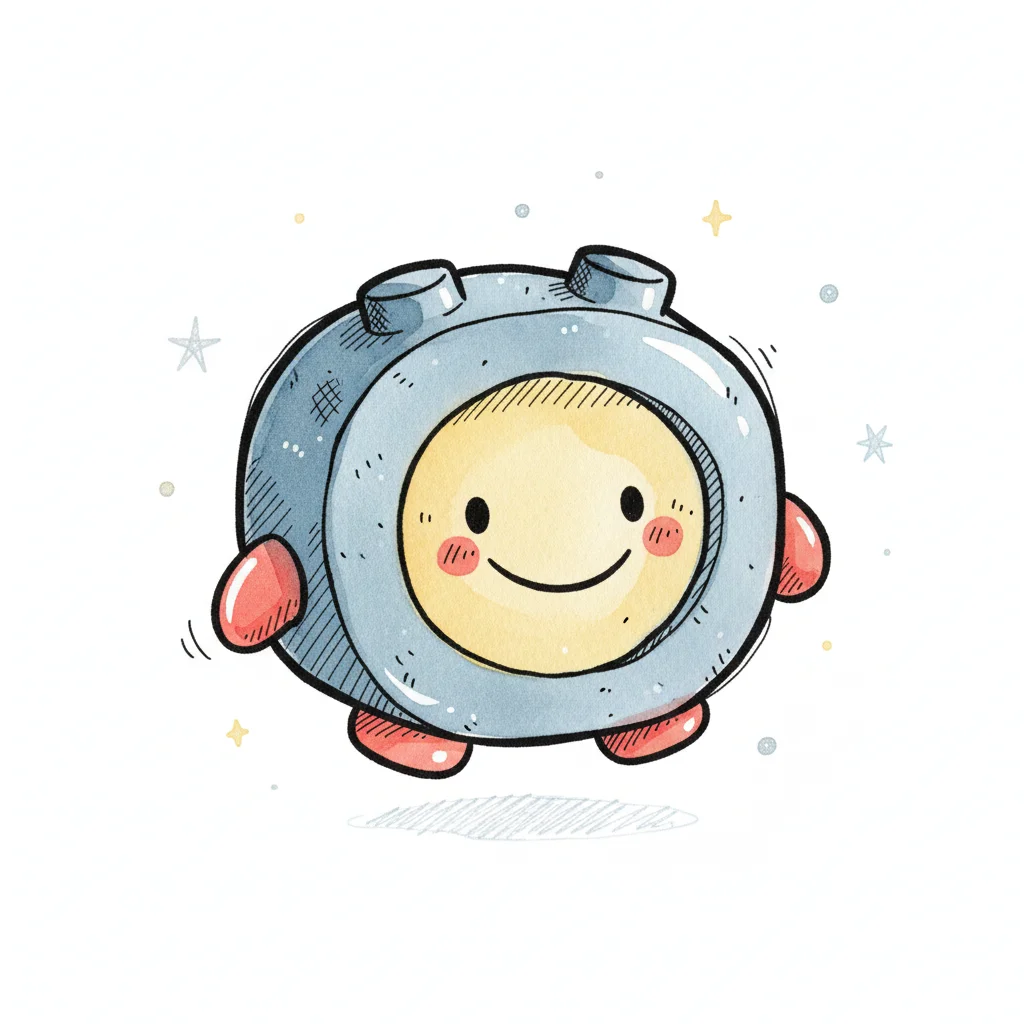 Niedlicher, runder Roboter mit offenem Fach, aus dem bunte Zahnräder fallen.