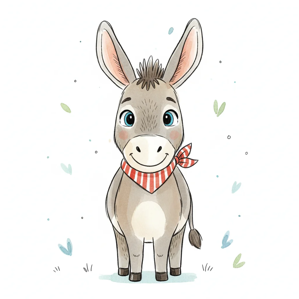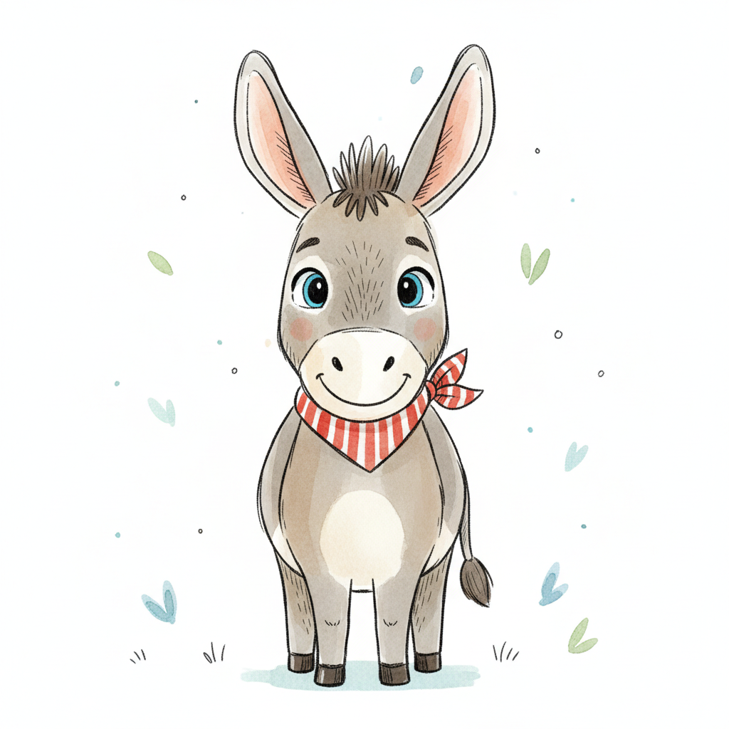 Ein fröhlicher Esel mit einem roten Halstuch und großen, blauen Augen.