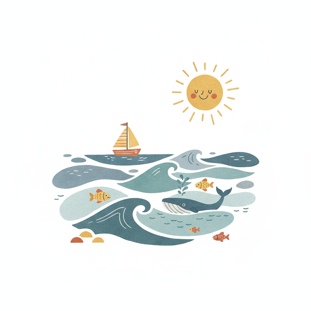 Fröhliche Meeresillustration mit Segelboot, Wal, Fischen und lächelnder Sonne auf sanften Wellen.