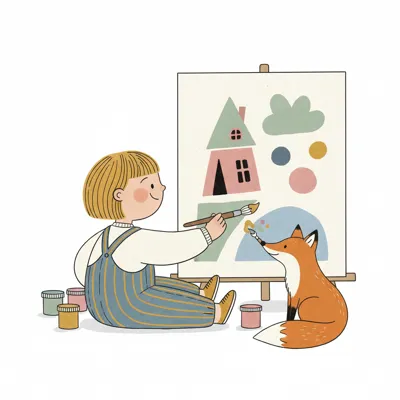 Ein Kind und ein Fuchs malen zusammen ein abstraktes Bild mit Häusern und Wolken.