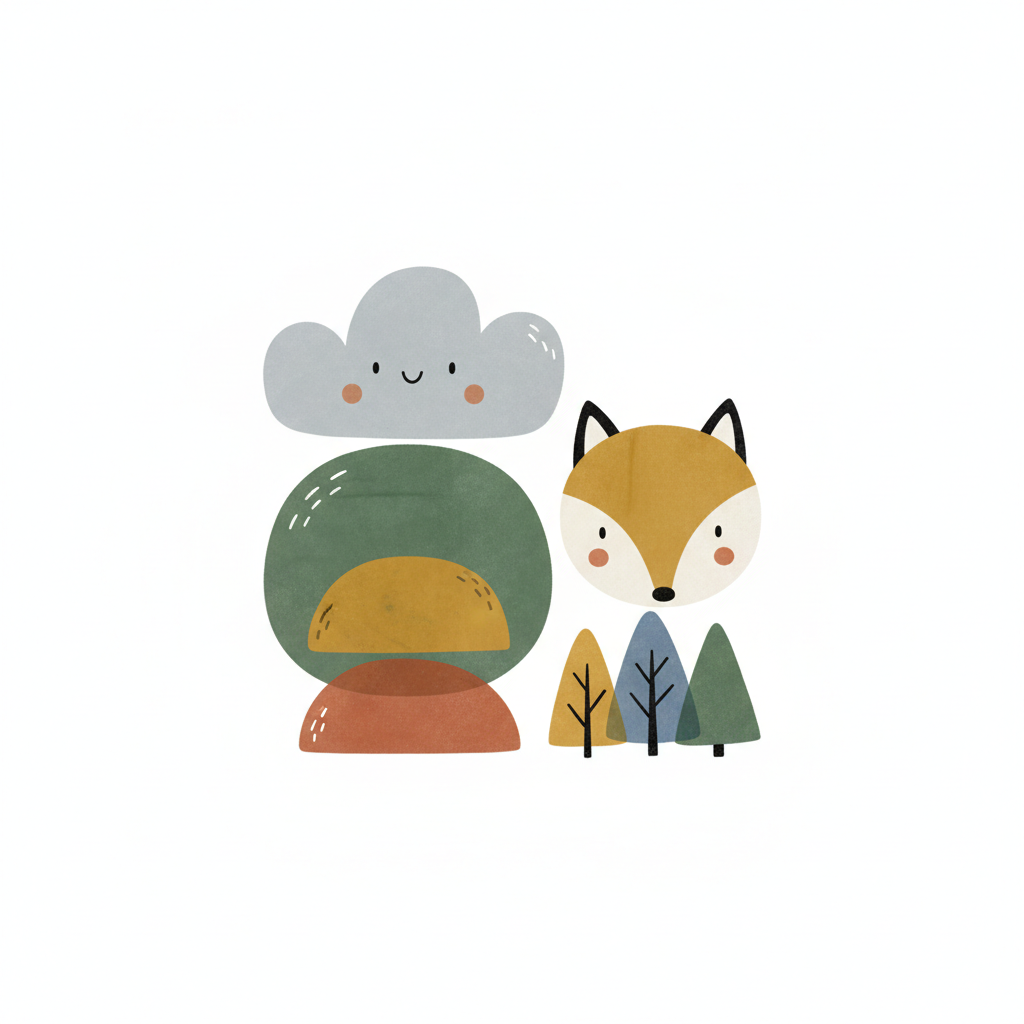 Niedliche Illustration mit Fuchs, lächelnder Wolke, Bäumen und Pilz in sanften Farben.