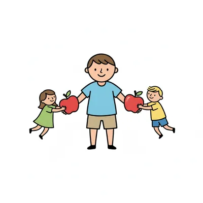 Ein Erwachsener hält Äpfel, während zwei Kinder daran ziehen.