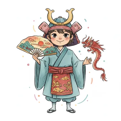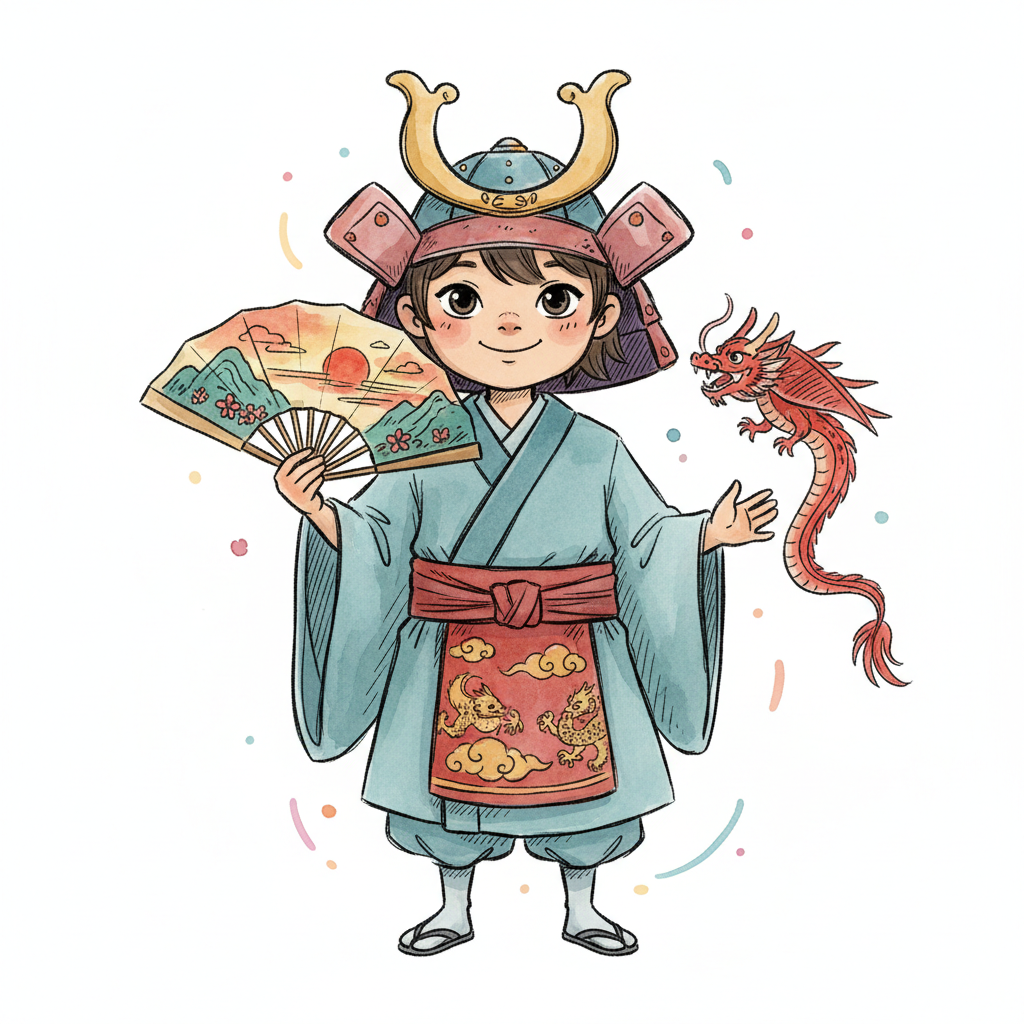 Niedliches Kind in Samurai-Helm und Kimono, hält einen Fächer, daneben ein kleiner roter Drache.