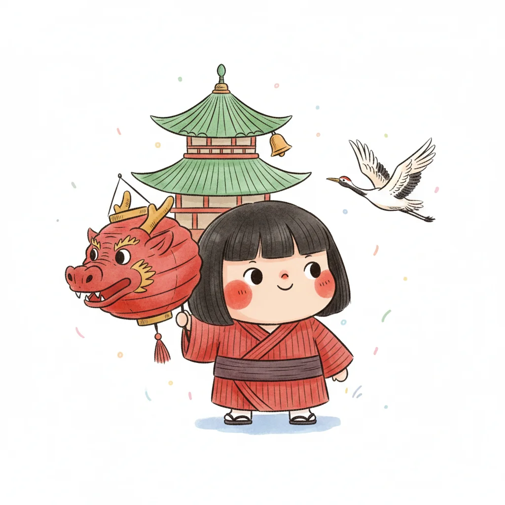 Niedliches Mädchen im Kimono hält Drachenlaterne, mit Pagode und Kranich im Hintergrund.