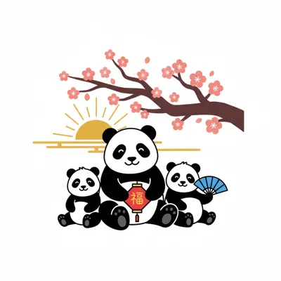 Drei niedliche Pandas unter Kirschblüten und aufgehender Sonne, einer hält eine Laterne, einer einen Fächer.