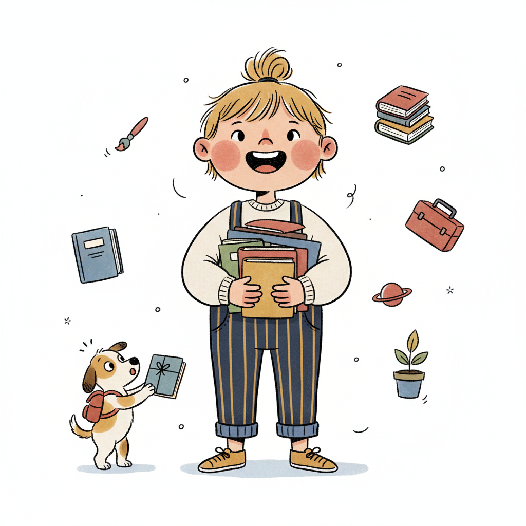 Fröhliches Kind mit Büchern, umgeben von Lern- und Kreativitätssymbolen, Hund bringt Buch.