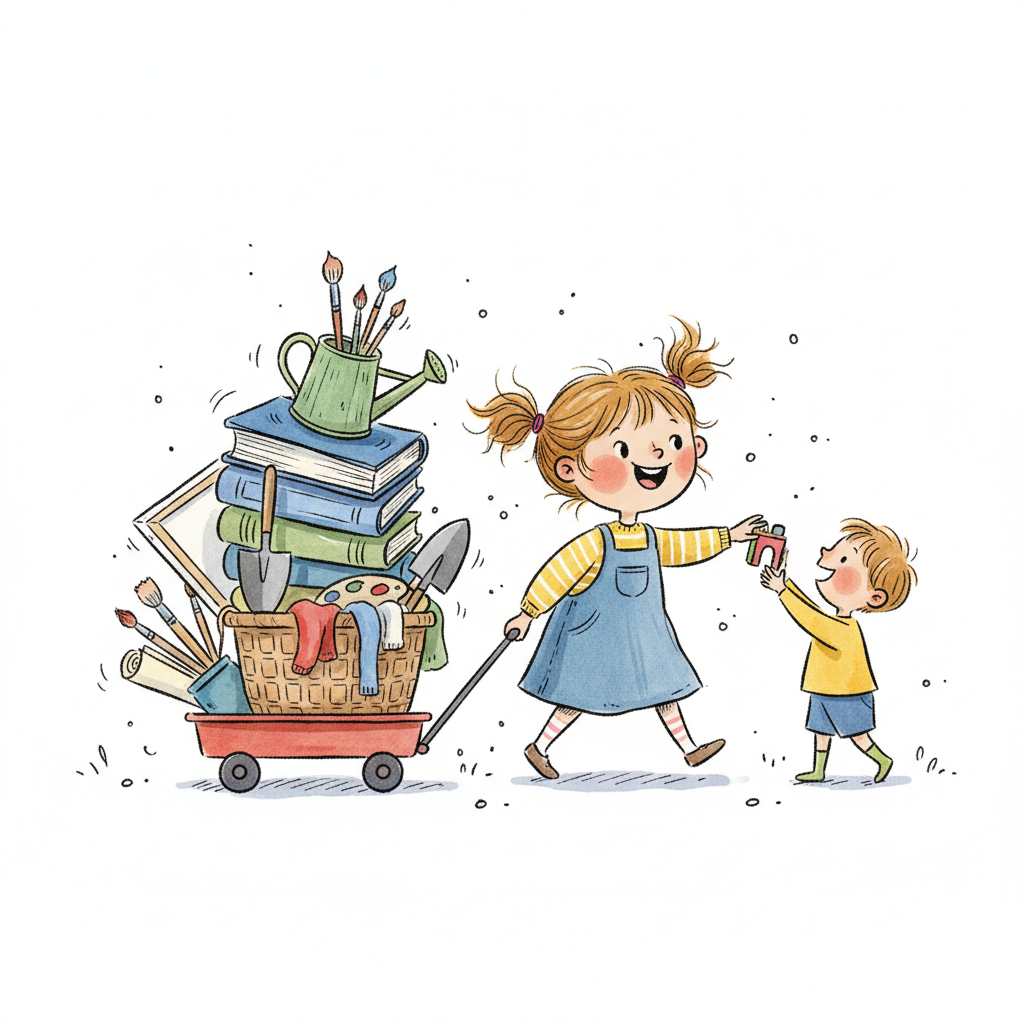 Mädchen zieht Wagen voller Bücher, Kunst- & Gartensachen, teilt Spielzeug mit kleinem Jungen.