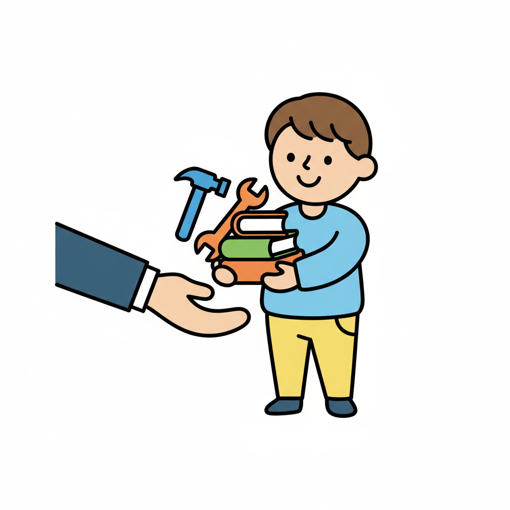 Ein Kind hält Bücher, Hammer und Schraubenschlüssel; eine Hand greift danach. Symbolisiert Bildung & Handwerk.