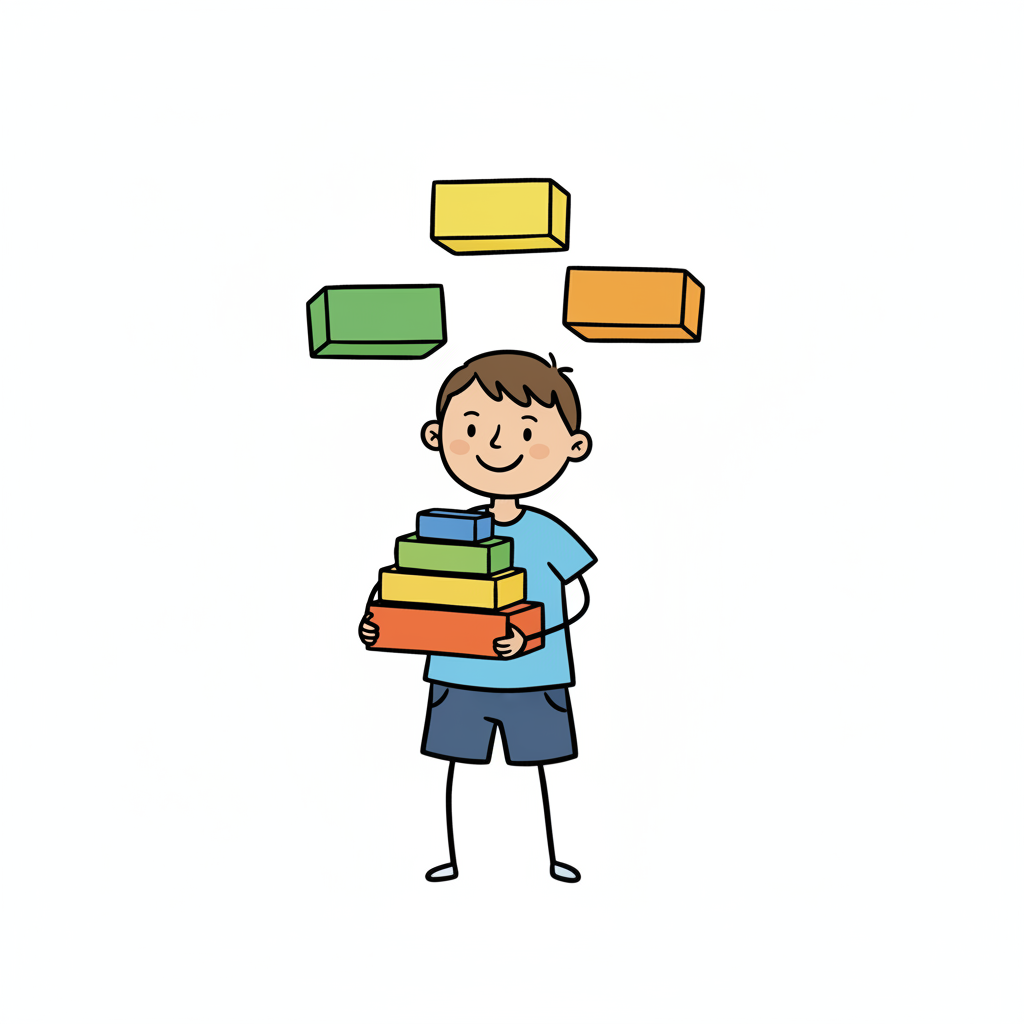 Ein lächelnder Junge hält bunte Bausteine, weitere schweben über ihm.