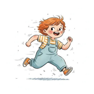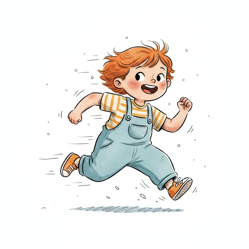 Fröhliches, rothaariges Kind in Latzhose rennt mit einem Lächeln.