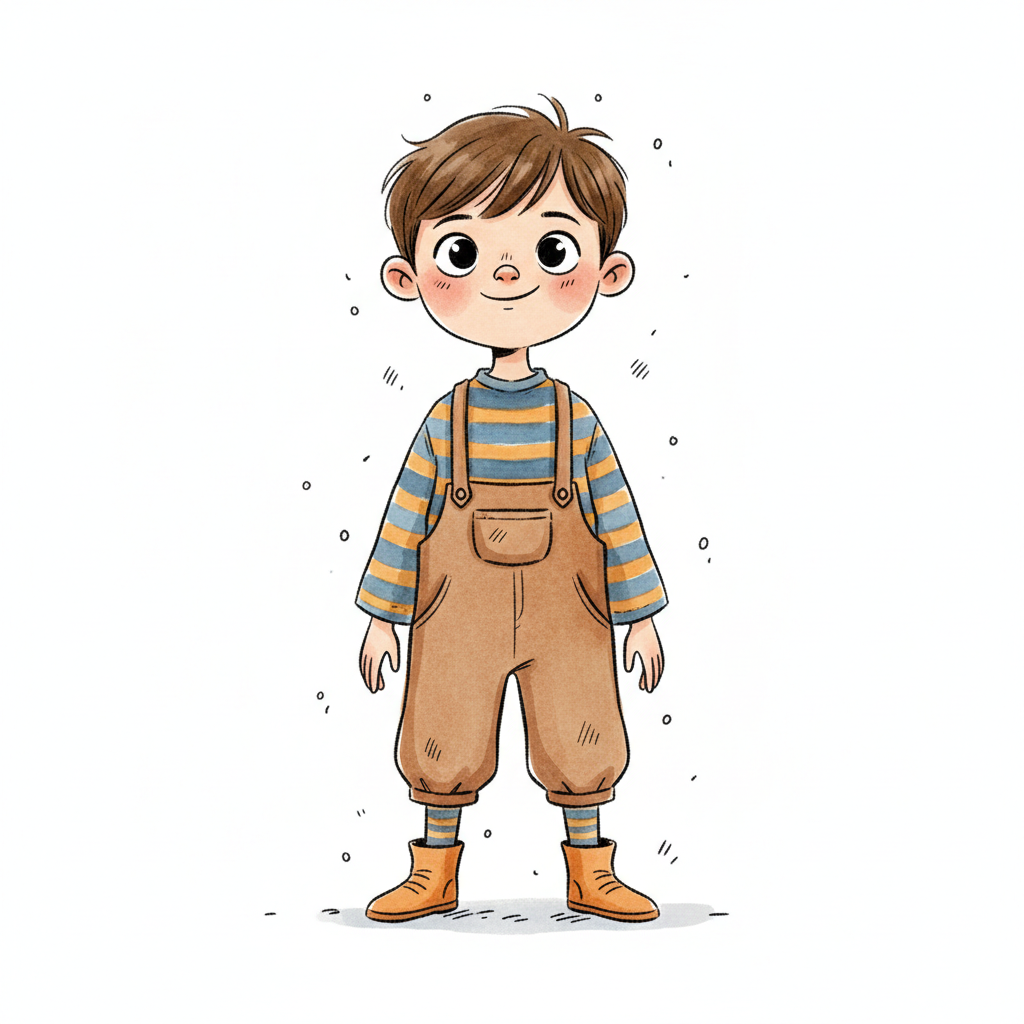 Niedlicher Cartoon-Junge mit braunen Haaren, gestreiftem Shirt und brauner Latzhose, lächelnd.