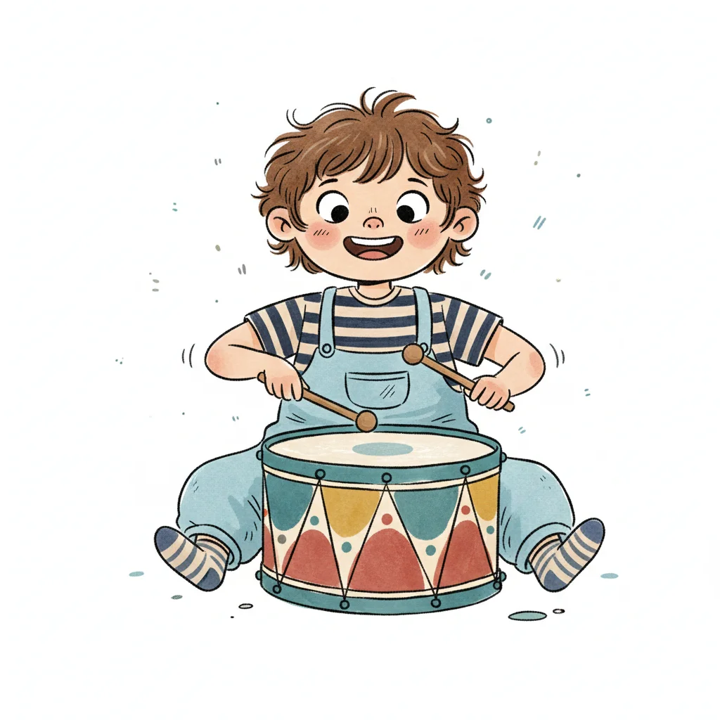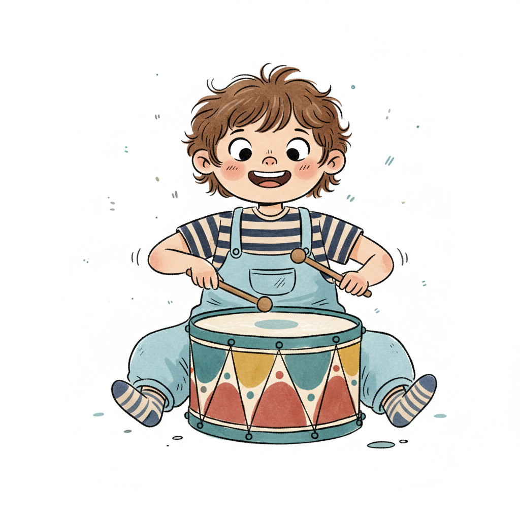 Glückliches Kind mit lockigem Haar spielt begeistert auf einer bunten Trommel.