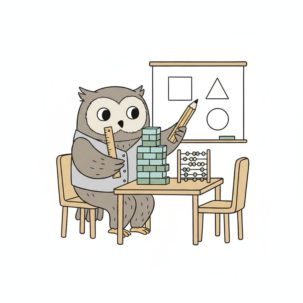 Eule als Lehrer mit Lineal, Bleistift, Bausteinen und Abakus vor einer Tafel mit Formen.