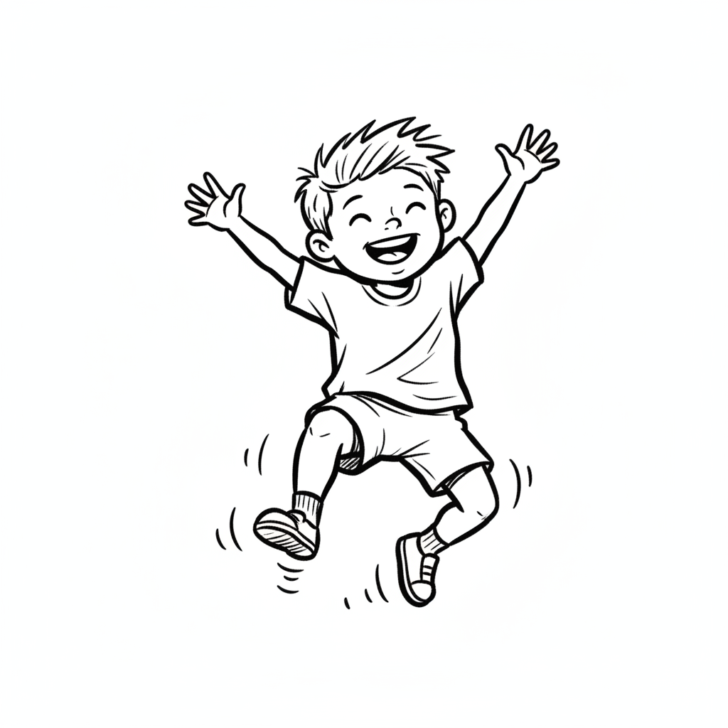 Fröhlicher Junge springt und lacht, Schwarz-Weiß-Illustration.