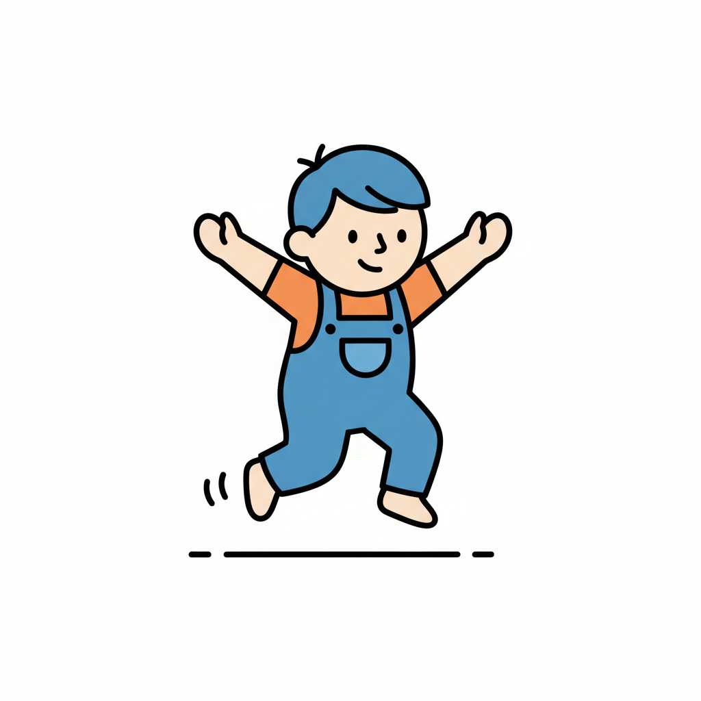 Ein fröhlicher Cartoon-Junge mit blauen Haaren und Latzhose springt oder rennt spielerisch.