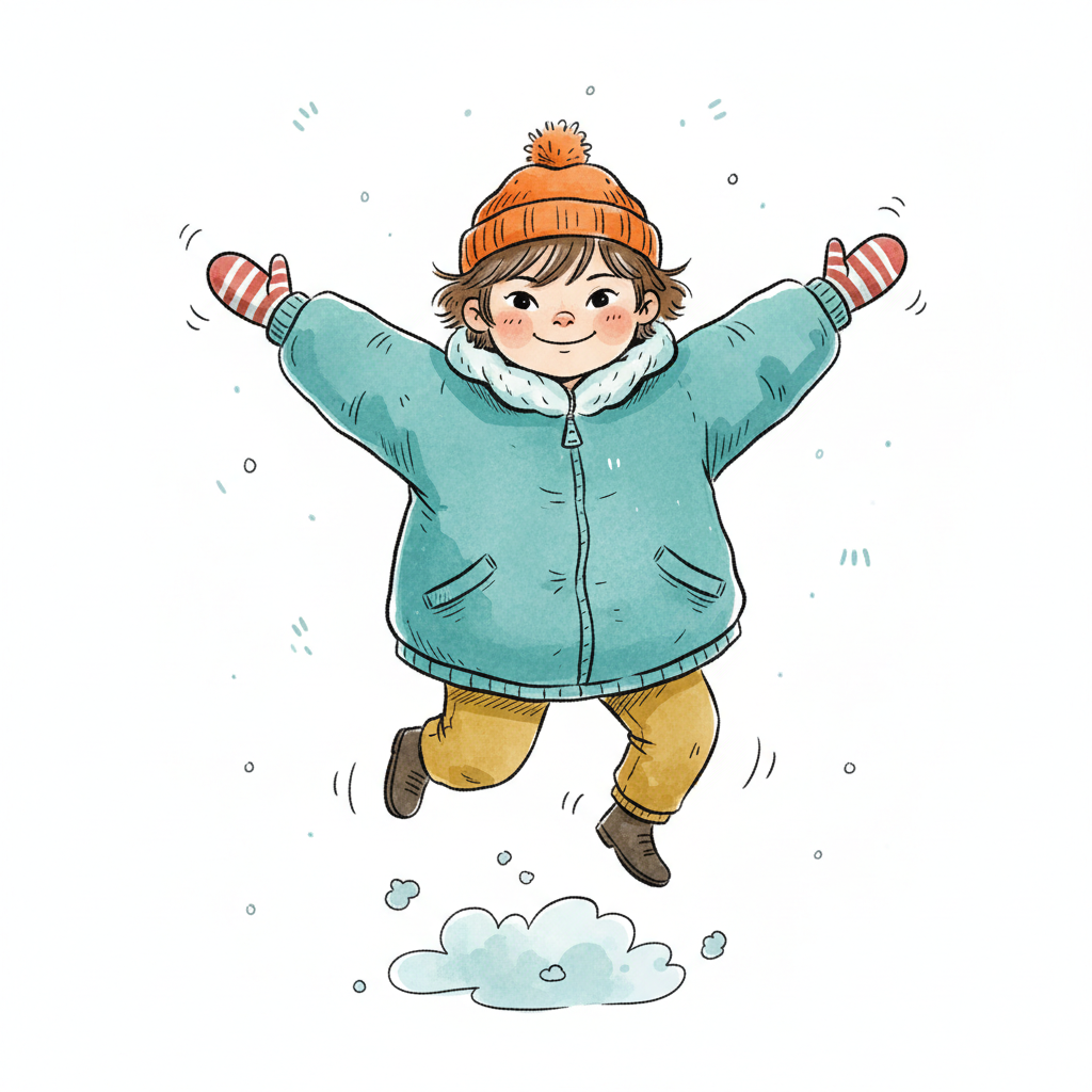Fröhliches Kind in Winterkleidung springt mit ausgebreiteten Armen im Schnee. Aquarellstil.