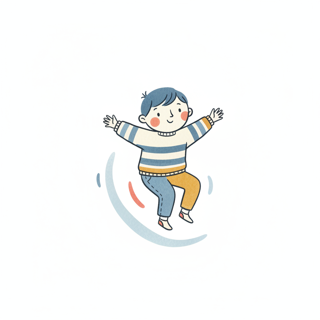 Niedliche, kindgerecht illustrierte Szene mit einem Kind oder einer Person als Hauptfigur, vor rein weißem Hintergrund, im frech-nordischen Aquarell-Skizzenstil. Klare, leicht wackelige Tuschekonturen, sichtbare Pinsel- und Strichtextur, dezente Schraffuren, weiche handgemalte Farbflächen in gedeckten Farben. Einfache, runde Formen. Keine harten Schatten, sondern sanfte, transparente Aquarellschichten. Leicht raue, handgezeichnete Linien statt glatter Vektorkanten. Subtile, vereinzelte Kritzelpunkte oder kleine Details im Hintergrund (wie Pünktchen oder feine Striche), aber keine echte Umgebung oder Landschaft. Die Figur ist mittig zentriert. Insgesamt charmant, humorvoll, warm und handgemacht wirkend. WICHTIG: Das Bild darf ABSOLUT KEINEN TEXT, KEINE BUCHSTABEN und KEINE ZAHLEN enthalten.