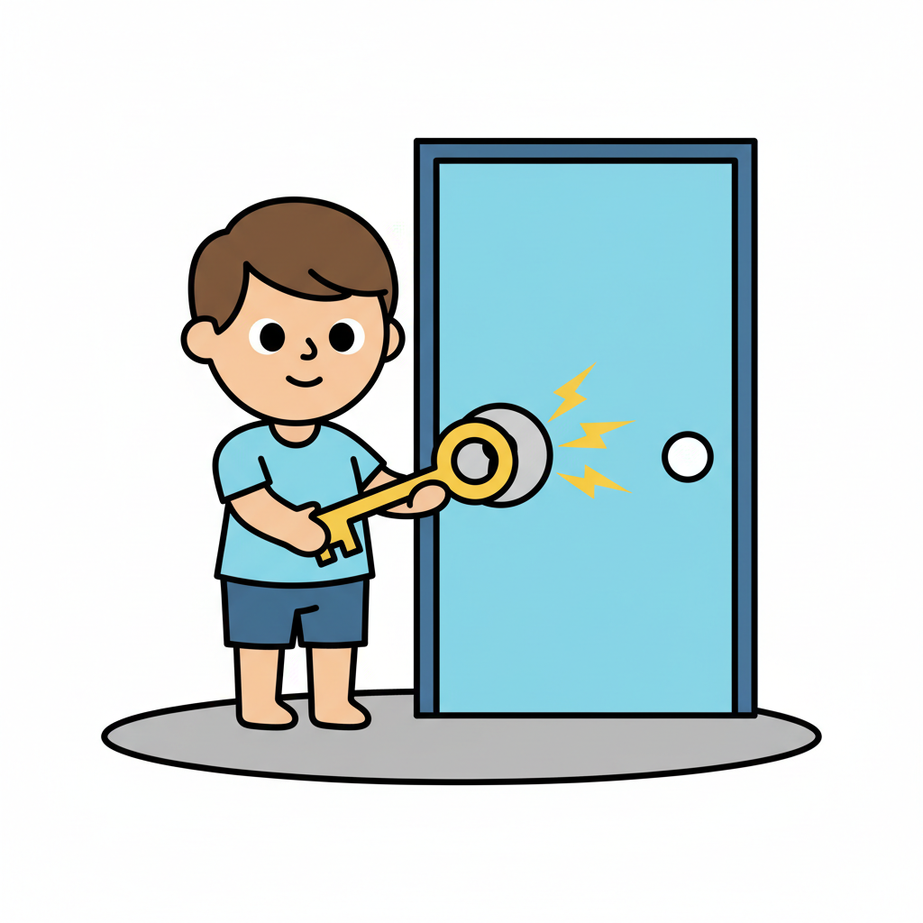 Ein Junge mit Schlüssel versucht, eine Tür zu öffnen.