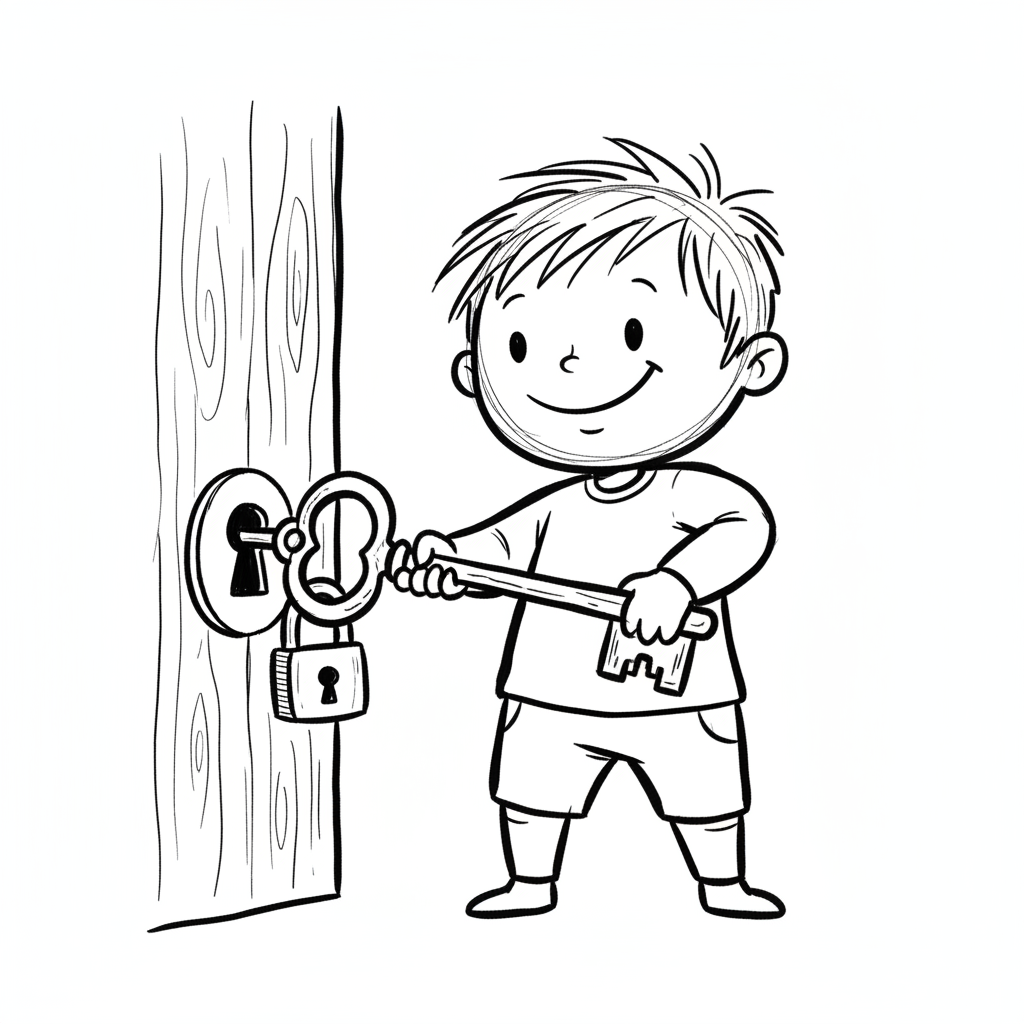 Ein Junge steht vor einer Tür und benutzt einen Schlüssel.