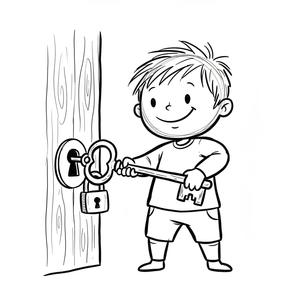 Ein Junge öffnet mit einem Schlüssel ein Schloss in einer Tür.
